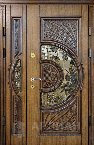 Двустворчатая входная дверь со стеклом и с витражом №76