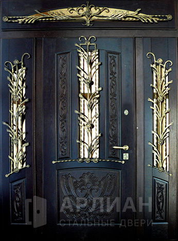 Двухстворчатая входная дверь со стеклом и ковкой №9