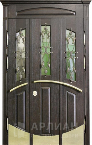 Входная коричневая дверь в частный дом со стеклопакетом и ковкой №11